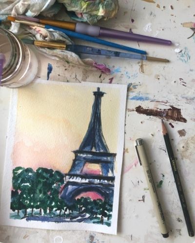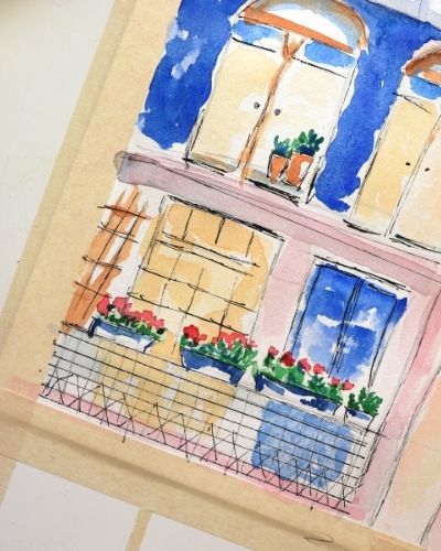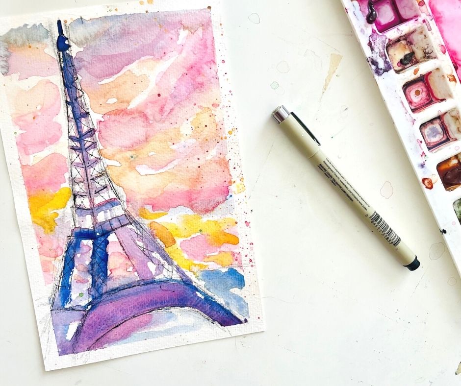 -Sketch with a micron pen, then add a gorgeous sunset with loose, playful color