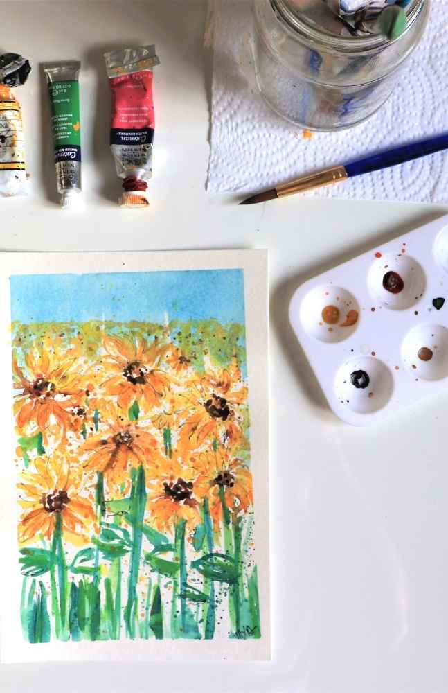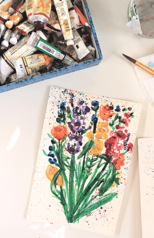I started "splatter painting" after a friend sent me a gorgeous acrylic painting of a field of flowers. The artist had placed layer after layer of paint on the canvas, then finished up with splatters, representing the hundreds of wild flowers in the field.