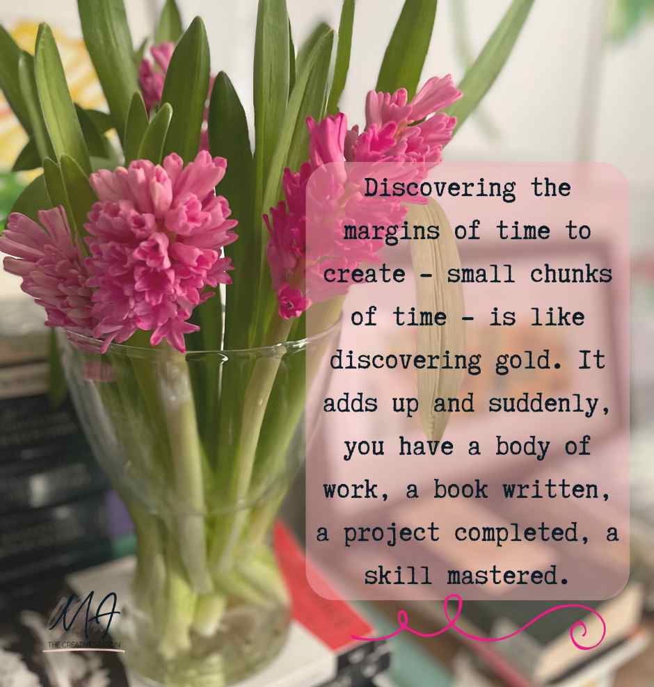 Take advantage of your margins. Maybe not all of them, but a few a week. See what happens when you begin to create consistently in the small chunks of time available. The laundry can wait (most of the time). The dishes can wait. Email can wait. The texts can be responded to in thirty minutes. Scrolling on the phone can wait for later too.