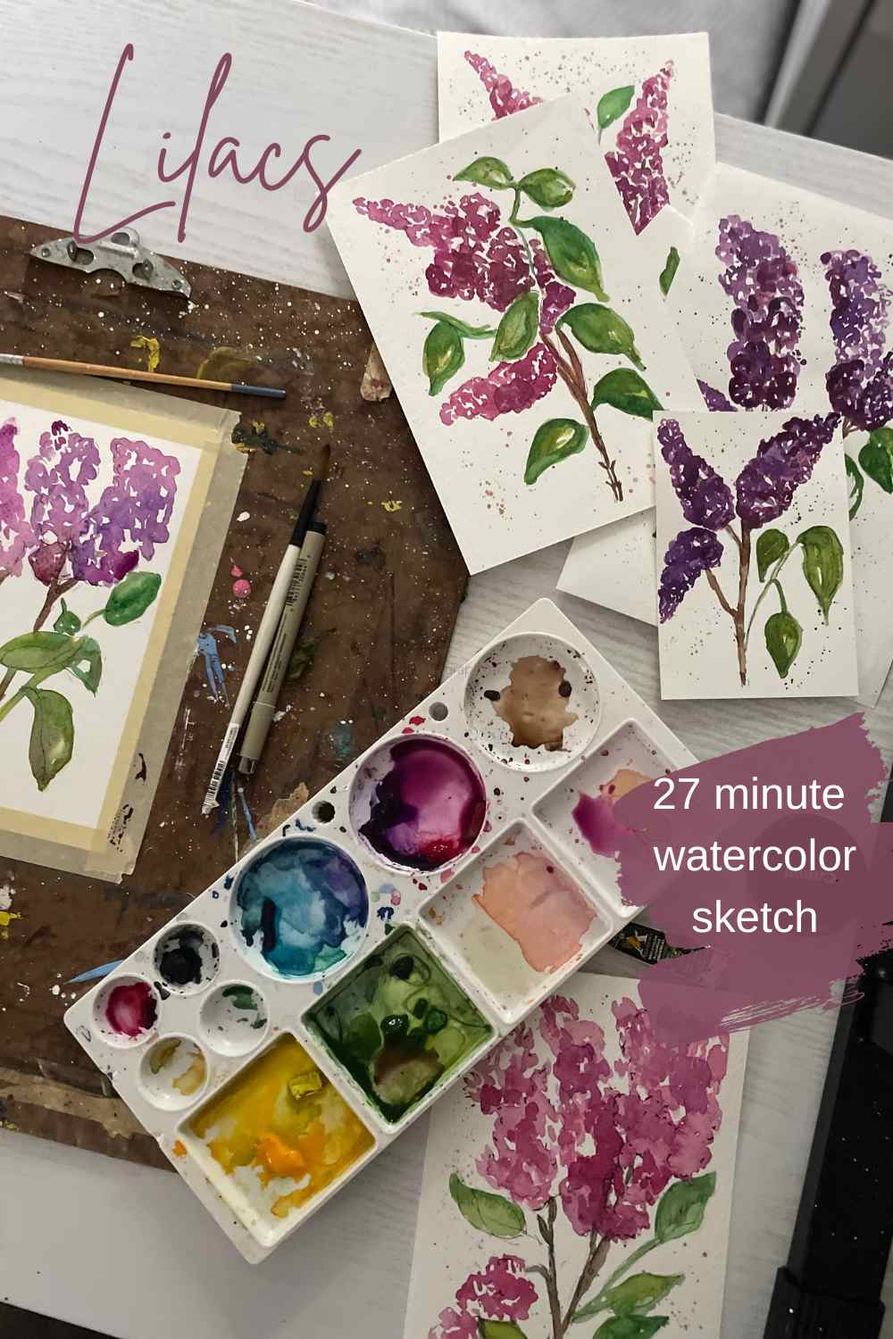After setting them up near the window, they begged to be painted. So out came the art board and a piece of 140lb. watercolor paper and my paints. It didn't take long to create a light watercolor sketch. The lilacs shape seems to be made for painting.