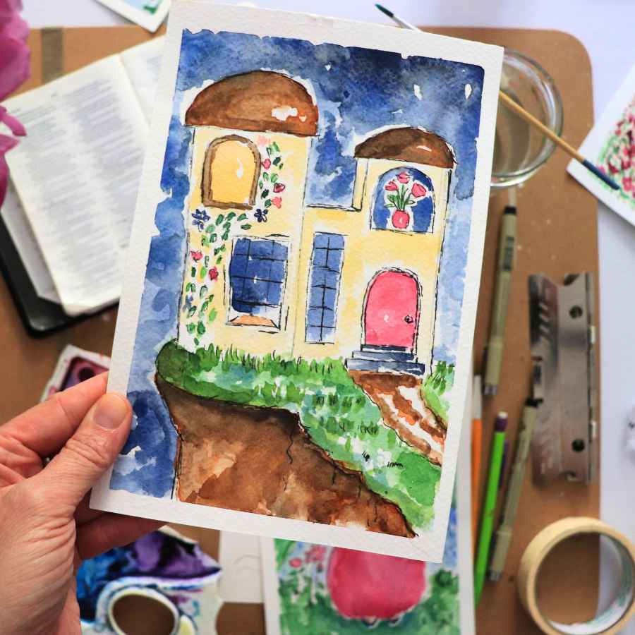 We start with a bit of splatter art to create the look of a vast field filled with wildflowers. Have you used a splatter technique before when painting with watercolor? It's so much fun.