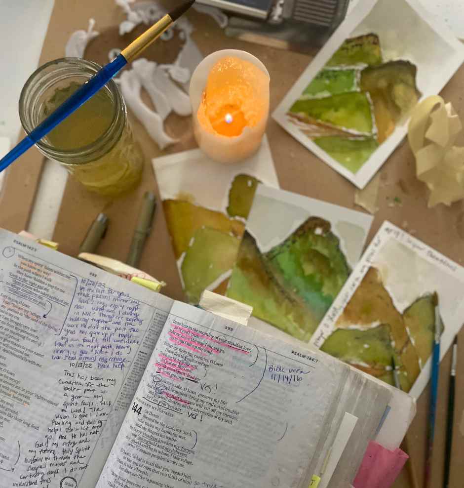 Of course, you can journey through the Bible with your pen and journal, grab some paint and paper, and paint through the psalms or another part of the Bible on your own. There are many wonderful bible studies, small groups, books to help facilitate you.