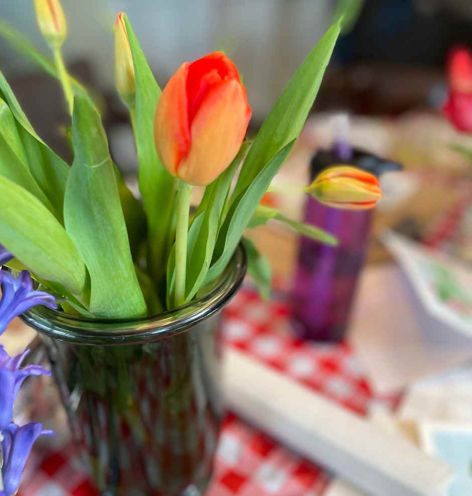 After settling in with food and drinks, we gathered around the table to paint. We were painting spring tulips with a splattering technique.
