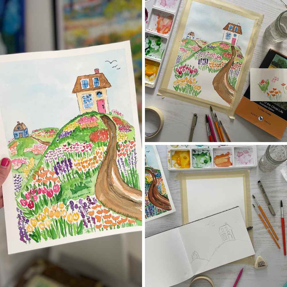 List of supplies included. Full sketching, painting, and "add in the details" included in this online self-paced course.