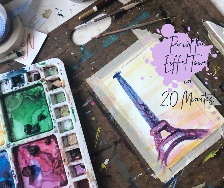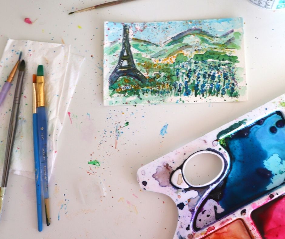 Add in layers of watercolor splatters to create a field of flowers around the Eiffel Tower.