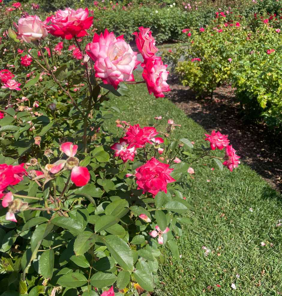 I walked down the steps and now saw why all the people were sitting and staring. My breath drew in more and more as I got nearer, finally descending the steps to enter the enclosed rose garden. Hundreds of roses filled the area, all meticulously cared for. I inhaled the sweet fragrance of fuchsia pink roses, aptly named Sweet Mademoiselle.
